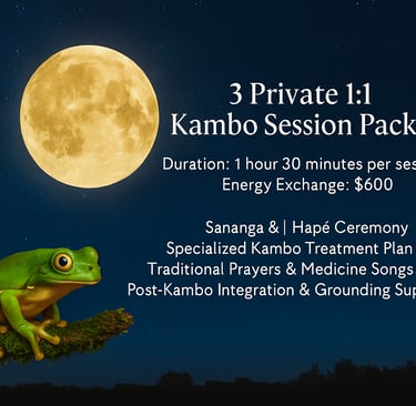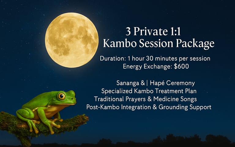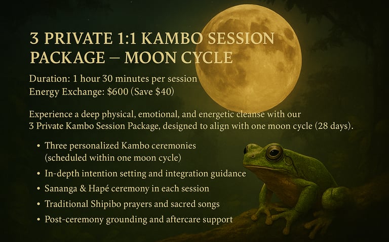 Traditionally, the Caboclo people of the Amazon recommend taking Kambo three times within one moon cycle (28 days). This sacred rhythm is known as the Kambo Inoculation — a complete energetic and physical reset that harmonizes the body, mind, and spirit with nature’s lunar flow.