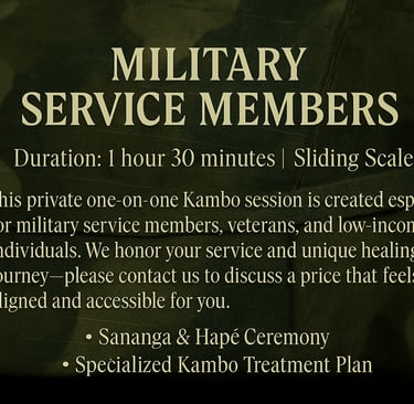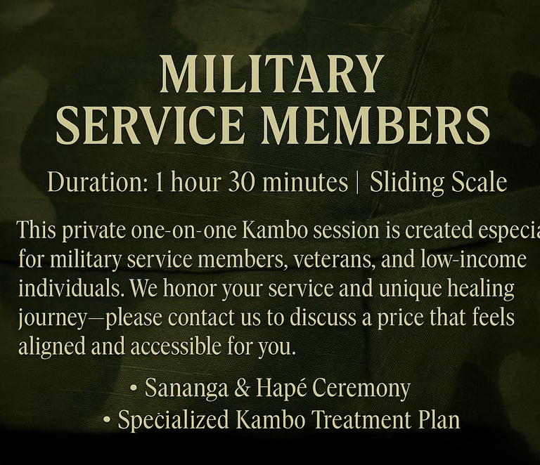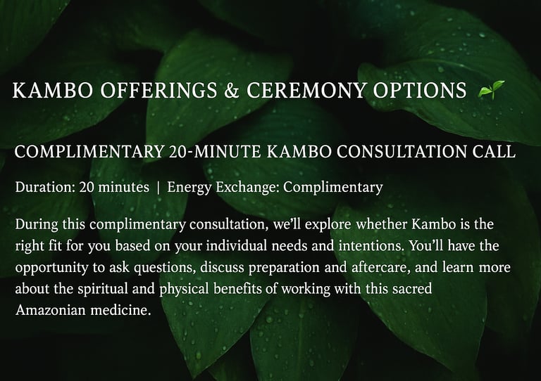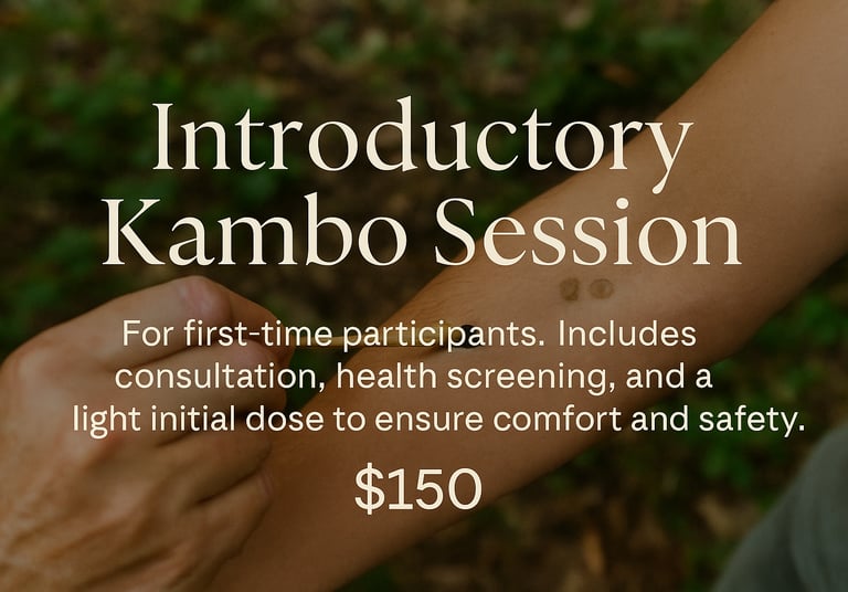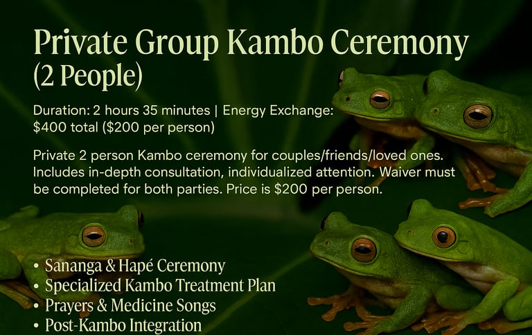 All clients are required to go through a screening process before participating in any Kambo ceremony. This ensures that Kambo is a safe and appropriate medicine for your current health and energetic state.